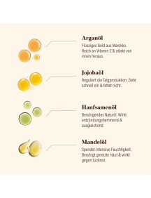 Die Kombination zwischen Sonnenblumen-, Mandel- und Aprikosenkernöl ist für das Gesicht besonders wertvoll. Auch das Hautgewebe profitiert davon, indem es von innen gefestigt wird und dadurch die Haut optisch wesentlich straffer wirken lässt. Diese Creme zieht erstaunlich schnell ein und hinterlässt ein erfrischendes Gefühl auf der Haut.
